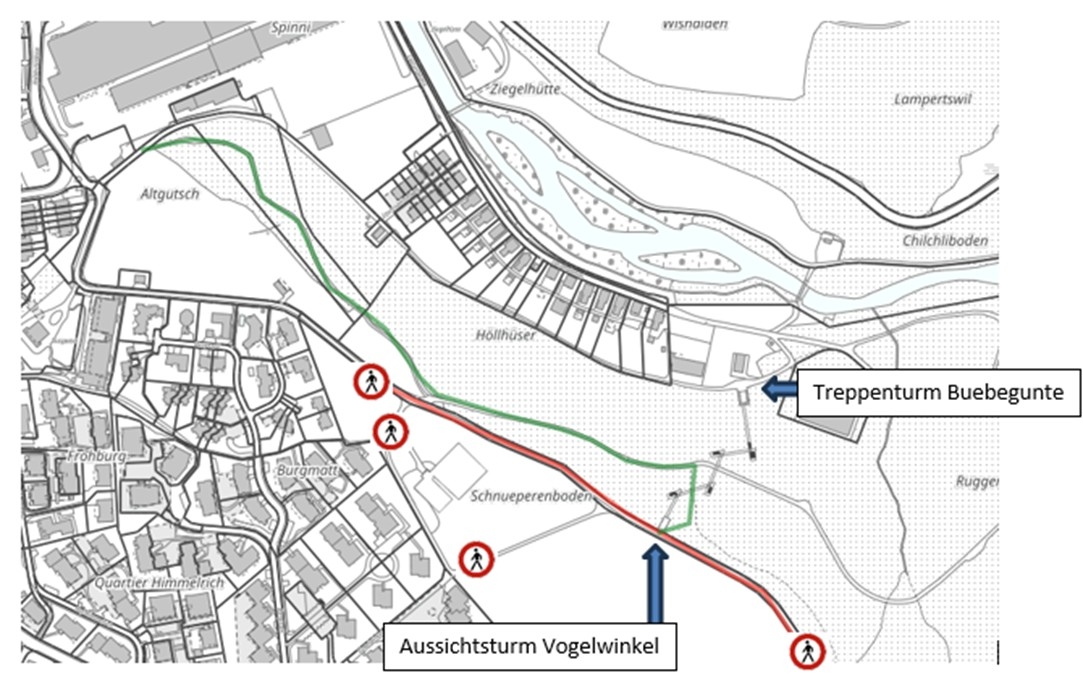 Während der 1. Etappe ist er ausschliesslich vom Wald her via Vita-Parcours erreichbar. Der direkte Weg über die Oberallmend-Strasse sowie der Zugang ab Vogelwinkel/Burgweid bleiben in dieser Zeit gesperrt. Weitere Hinweise gibt es unter schlaufensteg.ch.